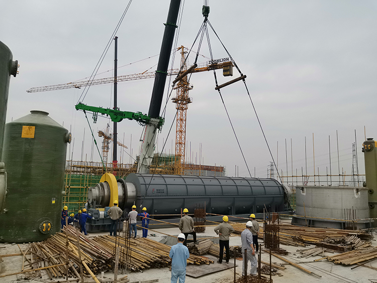 23日上午7點,隨著吊裝指揮的一聲令下,焙燒爐開始起吊。在現場所有建設者的注視下,500噸汽車吊平穩提升,至8點37分,焙燒爐順利吊至裂化劑廠房6米層樓板上。